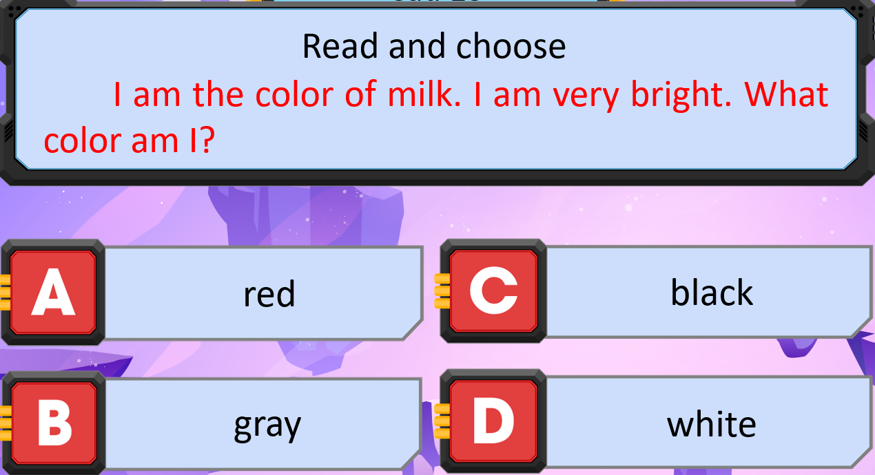 Giải thích: I am the color of milk. I am very bright. What color am I?: Tôi là màu của sữa. Tôi rất sáng. Màu sắc của tôi là gì?