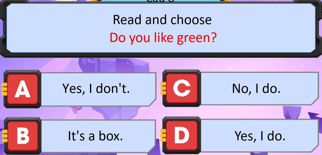 Giải thích: Do you like green?: Bạn có thích màu xanh lá không?