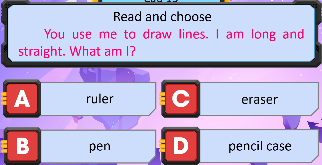 Giải thích: You use me to draw lines. I am long and straight. What am I?: Bạn sử dụng tôi để vẽ các đường thẳng. Tôi dài và thẳng. Tôi là ai?